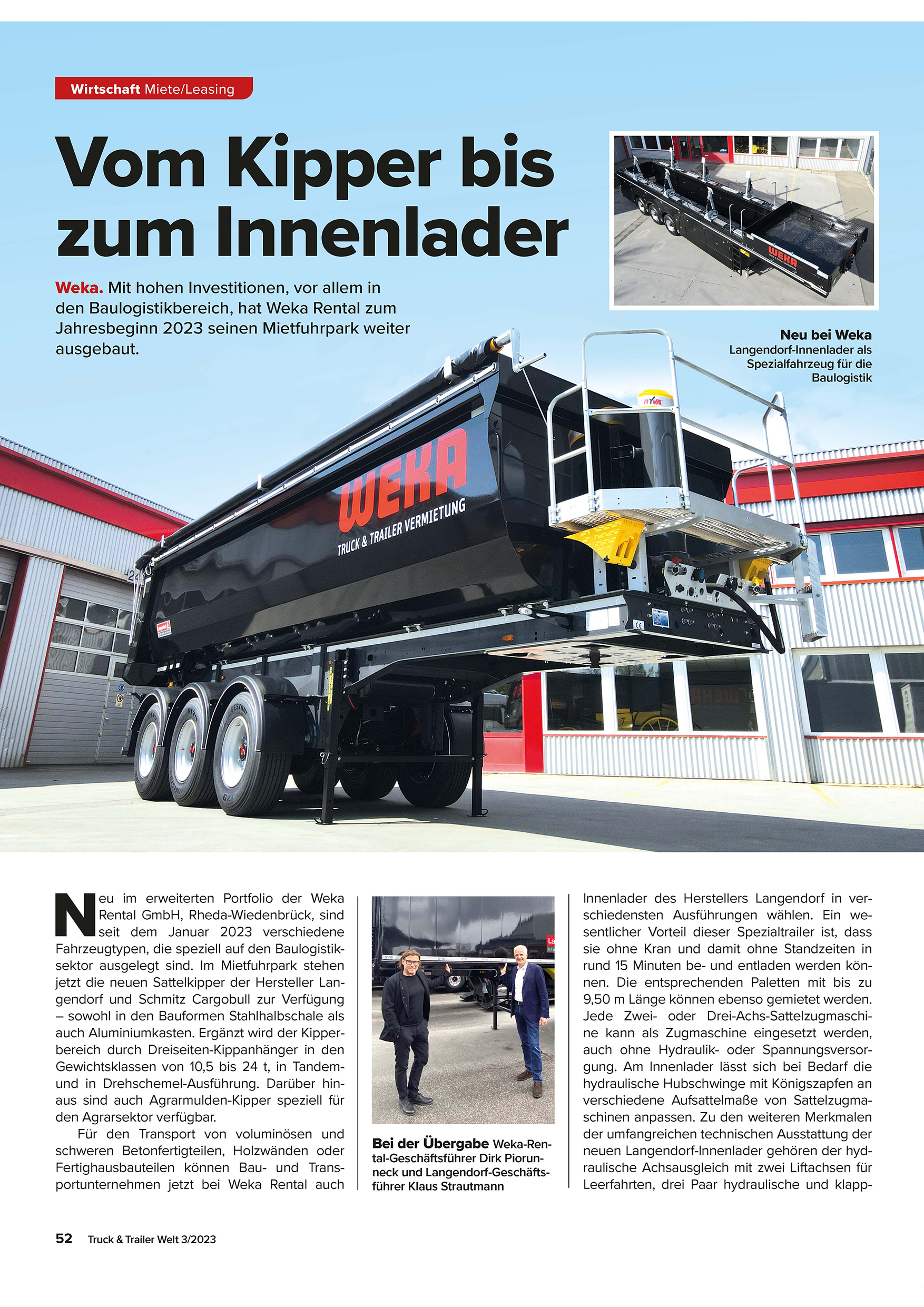 Durch die Erweiterung unseres Portfolios um hochwertige Fahrzeuge renommierter Hersteller wie Langendorf und Schmitz Cargobull können wir heute ein noch breiteres Spektrum anbieten, von Dreiseitenkippern über Asphaltmulden bis hin zu Spezialaufliegern für Betonfertigteile und Baumaschinen.