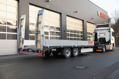 Der durchgesteckte Stahlrahmen aus Feinkornstahl gewährleistet hohe Verwindungssteifigkeit und lange Lebensdauer. Die breite, durchgängige Ladefläche mit Stahl-/Riffelblechboden erlaubt hohe Punktlasten und bietet optimale Belastbarkeit bei täglichem Baustelleneinsatz. Die 900 mm Heckanschrägung erleichtert das Auffahren von Maschinen und reduziert den Auffahrwinkel in Verbindung mit den schweren 2.300 mm Rampen.