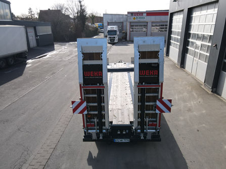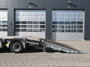 Mit klappbaren Auffahrrampen, optional hydraulisch verschiebbaren Rampen oder Verbreiterungsbohlen lässt sich der Anhänger flexibel an unterschiedliche Maschinen anpassen. So können kompakte Radlader ebenso sicher transportiert werden wie breite Baumaschinen oder Fahrzeuge mit Überbreite.